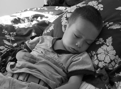 Today G slept in-would you believe it until after 9 in the morning! He had had two late nights so we decided to let him sleep and skip church. Not something we do often but we felt he could use the extra rest since we've all been so sick the last few months. Later in the day my son, my sweet little guy, had a temper tantrum that was almost laughable it was so dramatic. We hadn't gone through one of those in so long H and I just stared at each other and shrugged our shoulders. He was so tired from no nap, in the heat at a BBQ and then going swimming to boot that he just couldn't deal with himself anymore. G has this issue after swimming with his eyes being "swirly"-his term not mine. We try to get him to wear the mask but even when he does he won't let H suction it to his face to prevent the water from coming in so it's all for not. Our indoor pool is very chlorinated and it bothers him afterwards. Well, he must have gotten a wee bit over zealous b/c he was extremely congested as well and was trying to suck his two fingers and couldn't breathe through his mouth and his eyes were all swirly and on and on and on. He became so frustrated that he started screaming the second I mentioned nose drops to clear him up.